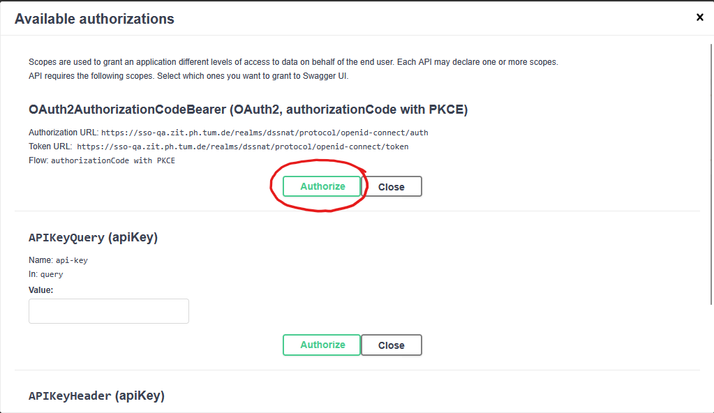 oben links oder das graue Schloß-Symbol, das bei allen Zugriffsbeschränkten Endpunkten angezeigt wird .In dem anschließenden Dialog "Available authorizations" klicken Sie im ersten Abschnitt "OAuth2AuthorizationCodeBearer (OAuth2, authorizationCode with PKCE)" erneut auf "Authorize".
