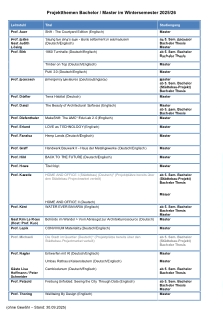 Hier finden Sie die Liste der Projekte / here you can see a list of offered projects: Plätze in Projektarbeiten für Studierende der Architektur werden nicht wie in anderen Lehrveranstaltungen über TUMonline zugeteilt, die Zuteilung erfolgt über den Projectmarket. Der Projectmarket ist das Vergabesystem für die Projektarbeiten ab dem 5. Semester im Bachelor Architektur sowie alle Projektarbeiten des Master Architektur. Das Vergabesystem ist als Service für eine faire Zuteilung der Studierenden konzipiert. Wie in allen Wahlangeboten kann Studierenden kein Platz in einem spezifischen Projekt garantiert werden. Durch die Angabe von vier oder mehr Wünschen werden die Interessen der Studierende bestmöglich berücksichtigt. Wichtig: Masterstudierende können maximal zwei Projekte am gleichen Lehrstuhl belegen (Projekt und Projekt Vertiefung). Bei einem dritten Projekt am gleichen betreuenden Lehrstuhl gibt es keine Credits. Achten Sie bei der Projektwahl auf diese Einschränkung! Ab dem 1. Oktober 2025, 8.30 Uhr können alle Studierenden Ihre Projektwünsche im Projectmarket eintragen. Dabei müssen mindestens vier (B.A.) bzw. sechs (M.A.) unterschiedliche Wünsche angegeben werden, es können aber auch mehr Wünsche angegeben werden. Am 6. Oktober 2025 um 11 Uhr werden die Projekte in Präsenz im Audimax vorgestellt. Alternativ können Sie der Veranstaltung über einen Livestream beiwohnen: https://tum-conf.zoom-x.de/webinar/register/WN_DrKY5pkQSVm0Pt2Dii66cA Registrierung erforderlich Am Montag um 15 Uhr schließt der Projectmarket. Das Ergebnis wird den Lehrstühlen am selben Tag per E-Mail zugesandt und ist für die Studierenden im Projectmarket einsehbar. Wichtig: Alle Studierenden, die an der Projektvergabe teilnehmen wollen, müssen im Besitz einer gültigen TUM-Kennung sein! Falls Ihre Immatrikulation zum Zeitpunkt der Projektvergabe noch nicht durchgeführt ist, können Sie per Mail an studienorganisation.ad@ed.tum.de einen Einmalaccount anfordern. Für Studierende, denen in der Vergabe kein Platz zugeteilt werden konnte, wird ein „Nachvergabe Projektmarket“ eingerichtet. Am Donnerstag, dem 9. Oktober ab 9.00 Uhr werden die freien Projektplätze angegeben und die Studierenden können Ihre Projektwünsche im Nachvergabe Projectmarket eintragen. Dabei müssen mindestens vier unterschiedliche Wünsche angegeben werden. Am 9. Oktober um 13:00 Uhr wird der Projectmarket für Eingaben geschlossen und die Vergabe durchgeführt. Das Ergebnis wird den Lehrstühlen am selben Tag per E-Mail zugesandt und ist für die Studierenden im Projectmarket einsehbar.Projektvergabe Wintersemester 2025/2026