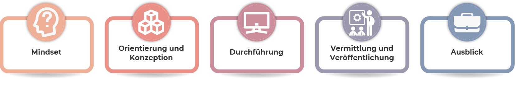 Wissenschaftliches Arbeiten ist ein Prozess, den man Schritt für Schritt erlernen und durchführen muss. Genau so ist auch dieses E-Learning aufgebaut. Es orientiert sich an den typischen Phasen eines wissenschaftlichen Projekts: