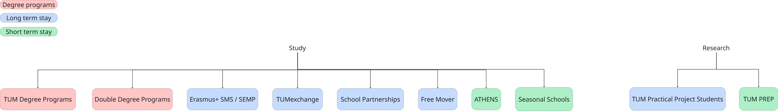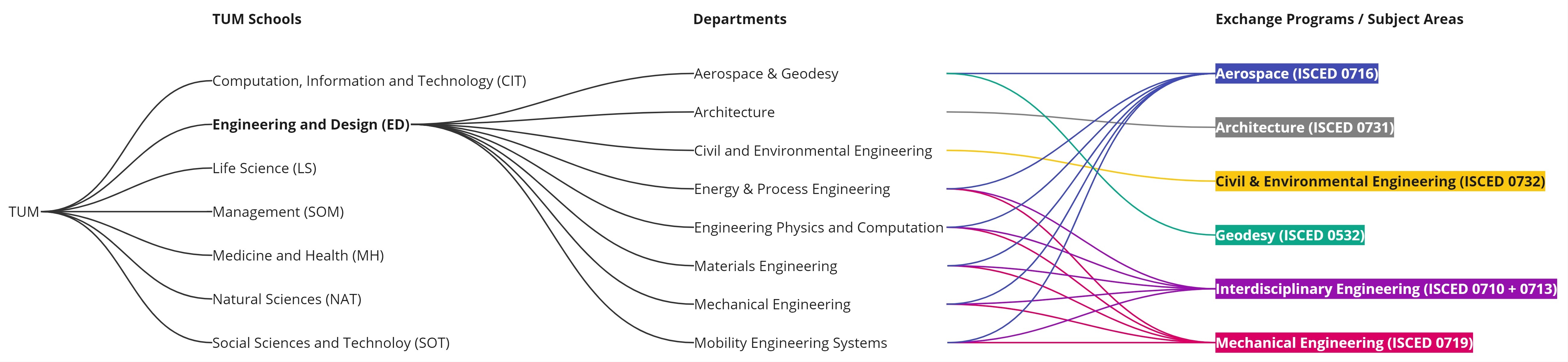 This organisational chart illustrates the relationship between the exchange programs, the organisational units of TUM and the TUM School of Engineering and Design.