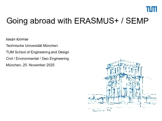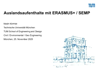 Sie finden alle Informationen zum Erasmus Programm und Kurzportraits unserer Partneruniversitäten in der aktualisierten Broschüre (Stand Oktober 2025). Die Broschüre richtet sich an Studierende der TUM School of Engineering and Design - Subject Areas Civil and Environmental Engineering / Geo Engineering. Mit dem Erasmus Programm können Sie im europäischen Ausland studieren oder ein Praktikum absolvieren.