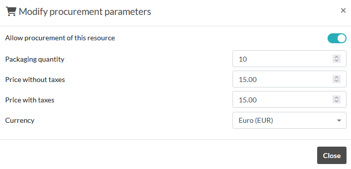 Just like a resource can be made bookable, it can be made procurable. Warning: This feature is still in beta.