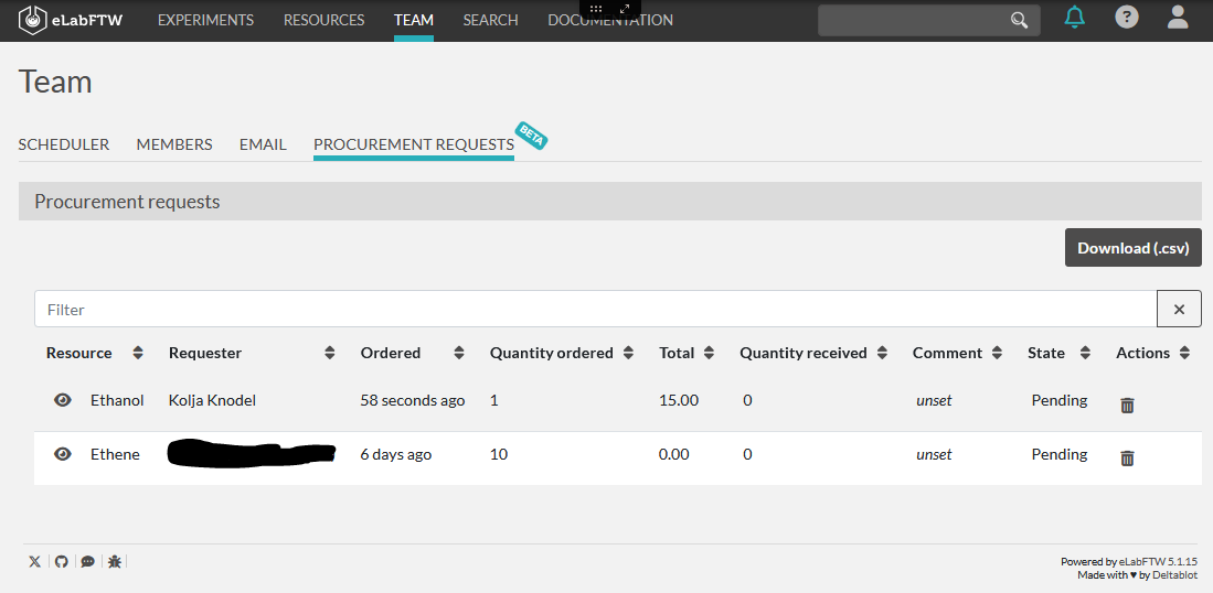 Under Team and Procurement Requests you will then be able to get an overview over all orders. Here you can specify the received quantity, comment orders, change the state or delete orders.