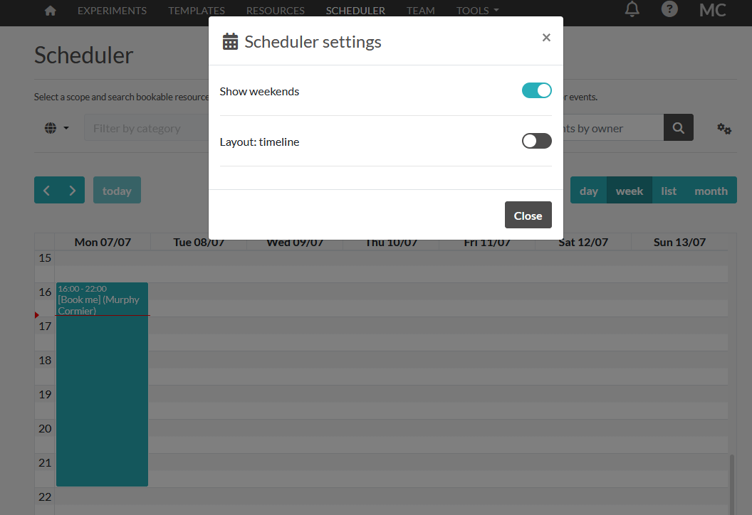 2. Click on the entry to edit time and date, comment, bind an experiment or resource or cancel the booking.