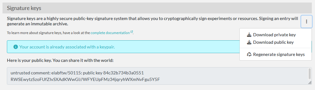 Before a user can sign an entry, they must generate a cryptographic key pair from their User Control Panel under Settings → Account → Signature keys.