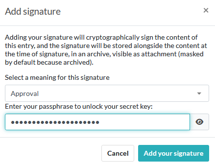 Experiments and Resources can be cryptographically signed. The signature will be stored alongside the content at the time of signature, in an archive, visible as attachment.