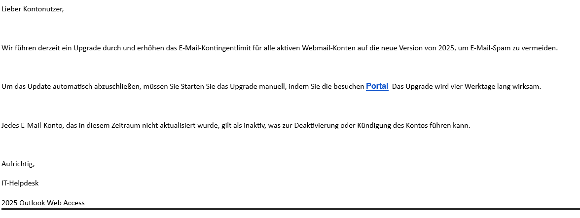 Eine Phishing-E-Mail mit fogendem Inhalt ist am Wochenende (Freitag, 29.11.2024) vielfach verschickt worden.
