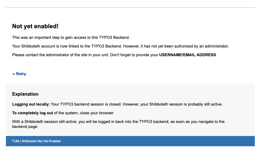 Note: The first attempt will always result in an error message. This is not a problem, as it ensures your TUM credentials are registered in the TYPO3 backend.