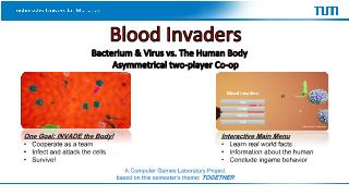 I would focus more on the co-op part of the game as on implementing an realistic immune system. How can the two players help each other in the fighting.