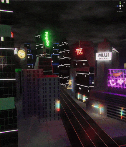 The other part of the equation is the actual backdrop. Our setting is that of an asian downtown district, so the backdrop needed skyscrapers, neon lights and a dark, broody sky. The skyscrapers were taken from a few packages in the asset store, but materials were adapted to include more emissive detail. A variety of neon signs were created, some designed from the ground up, some taken from existing logos. The skybox was changed to convey a dark night and a slowly advancing cloud layer added. While a soundscape and some ground movement for the backdrop is still missing, it already gives a much better idea of what the setting of the game is. This step also included some experimenting with lightmapping setups and emissive mapping.