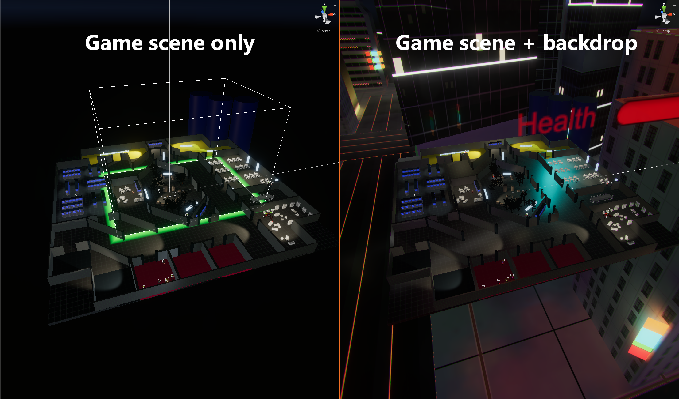 Visuals were another big change for the feeling of the game. The interim demo still only had the level without any surroundings, unrefined materials and simple lighting. For the alpha, I added a more sophisticated backdrop. For one in functional nature: the backdrop would be the same for any level, so integrating it directly into the actively played level would be a waste of memory, mapping times and storage. Instead, Unity supports so-called additive loading as well as "object persistence". The idea was to load an arbitrary game scene and then additively load the backdrop scene. Turns out that additive loading breaks lightmap assignment and completely nukes lighting of the backdrop. But object persistence doesn't, so now the system is a bit more clumsy and less optimized, but works the same on a high level and lighting remains functional.