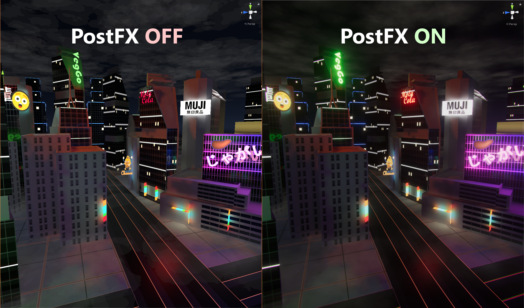 Another core component to the visual style is post-processing. Using the Unity post FX stack, I added tweaked bloom, lens effects, AO, HDR mapping, filmic tonemapping, screenspace reflections and depth of field. This went a very long way in conveying a fitting look for neon signs, fire, and other bright effects as well as enhancing contrast to give a stronger darker look to the game.