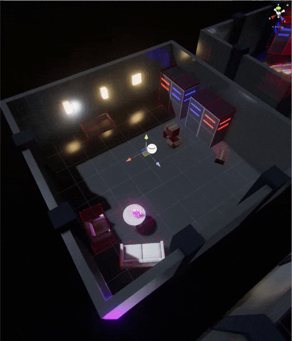 To elevate the random map generation from a prototype to a usable tool, we needed prefabs for the modules that the generator uses. Rooms, corridors and junctions. The next issue that presented itself was that these rooms would need to be filled with props: furniture, lights, decorations etc. Manually placing these would be a chore, especially if we want some variety, so instead of doing that, I introduced a Random Object Instancer. It's a gameobject to be placed in a room, a certain maximum boundary volume is specified and a list of allowed objects is added. Then as an editor tool, an arbitrary number of these ROI can be selected and at the press of a button they place a random object from their assigned lists into the scene. This way the designer only needs to specify the basic layout of items in a room but visual variety can be changed with a single click. Some of the individual props for the ROI were taken from the asset store, some simpler ones were created manually.