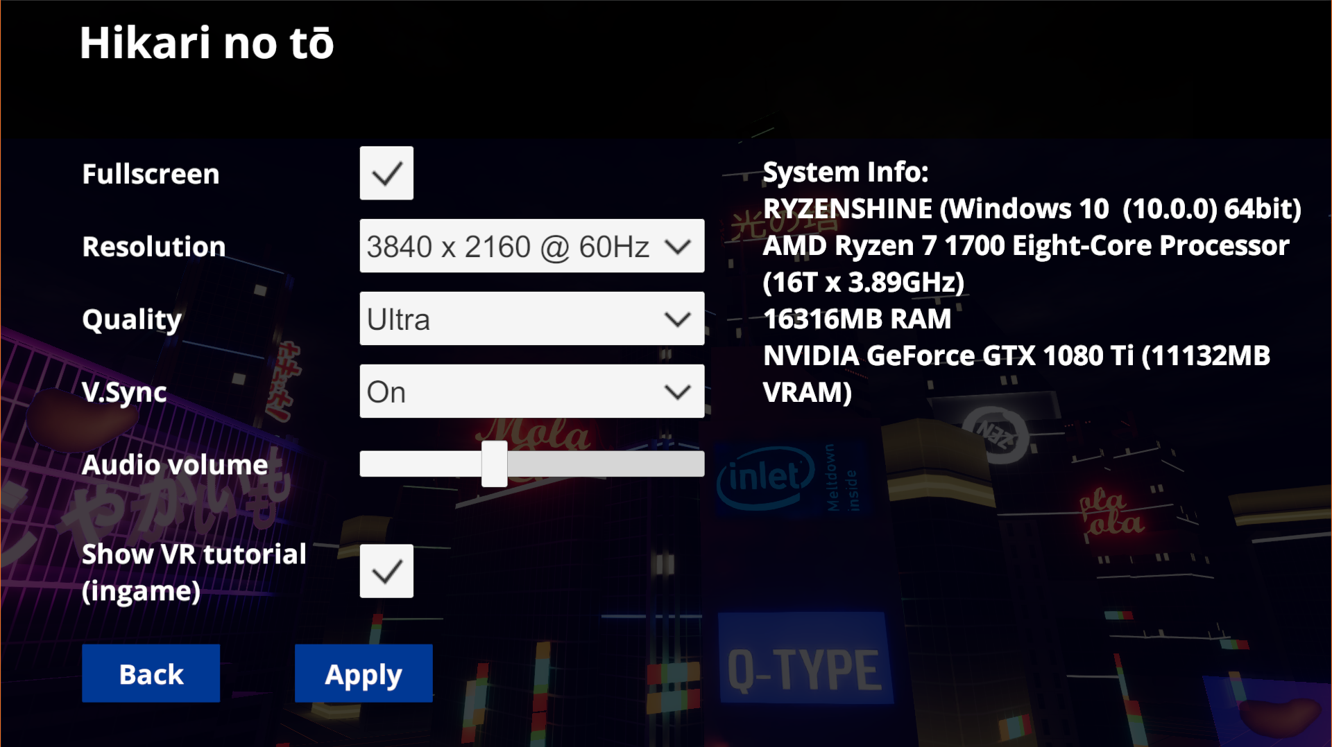 First, in the main menu, the settings section was expanded to offer audio volume control, the option to show a VR controls reminder when playing VR and a - admittedly gimmicky - system info, which really only shows your machine's core specifications as an orientation.