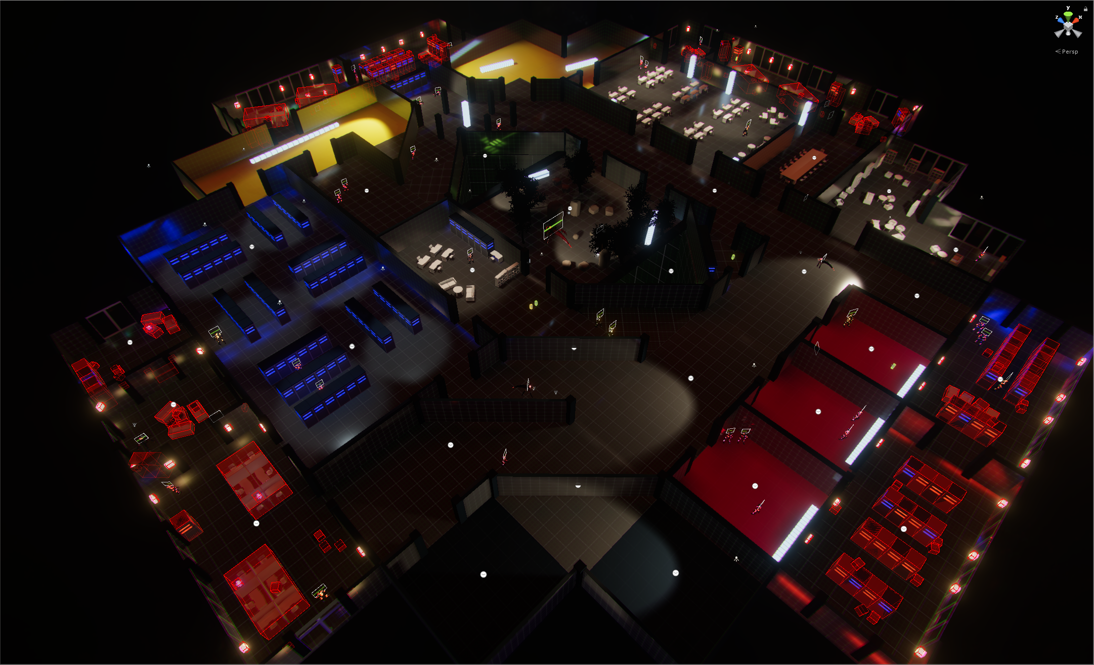 After a lot more details were added to the level, making the final picture contrast and complex, visibility of certain things became significantly lower. For instance, it was almost impossible to use Enemy Detection ability of our glorious infiltrator, since the highlights were hardly visible. For the sake of a better visibility, a new shader is introduced! It also looks more visually appealing and... highights the boss with a menacing red color.