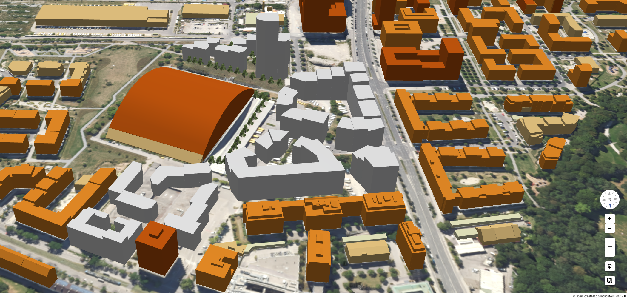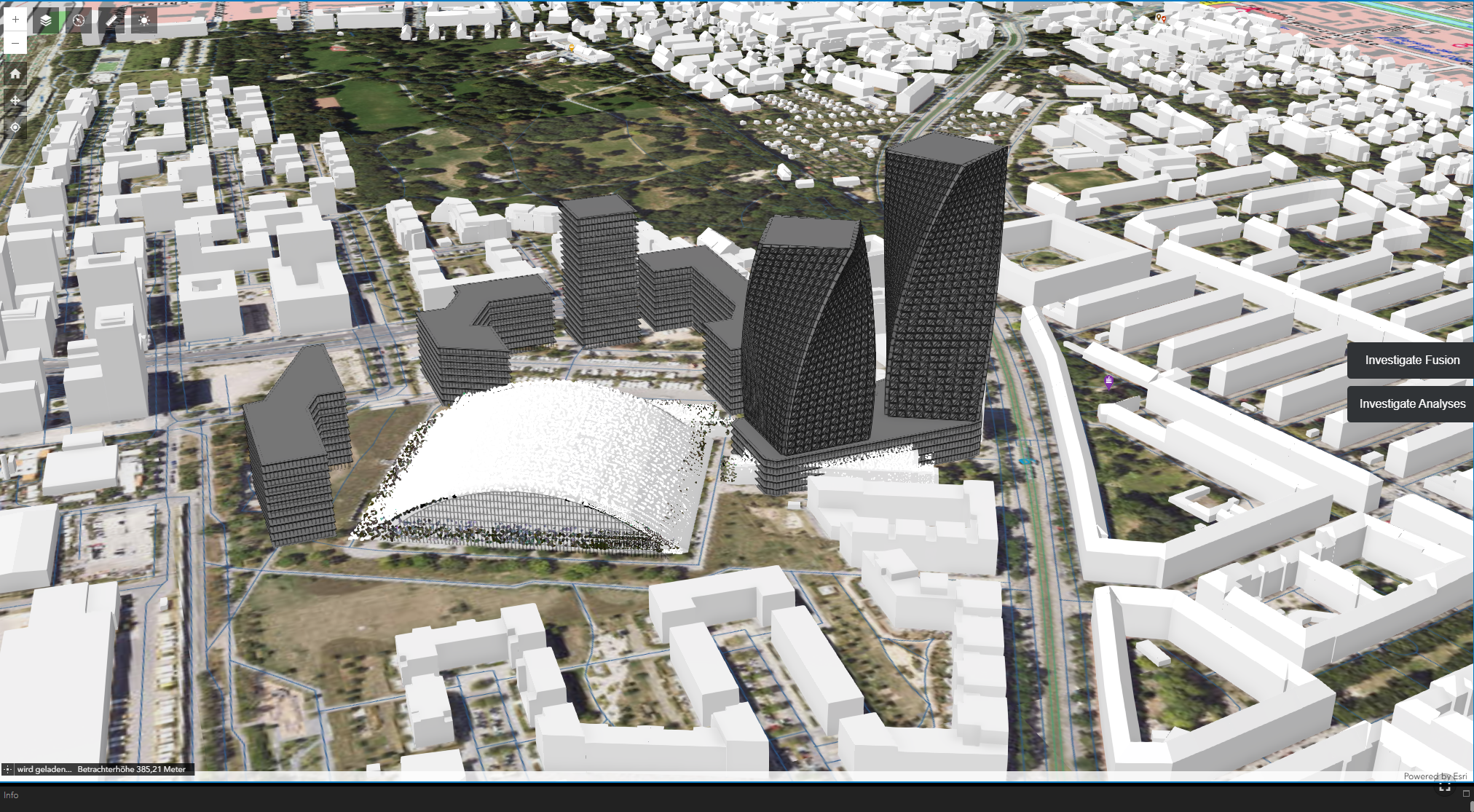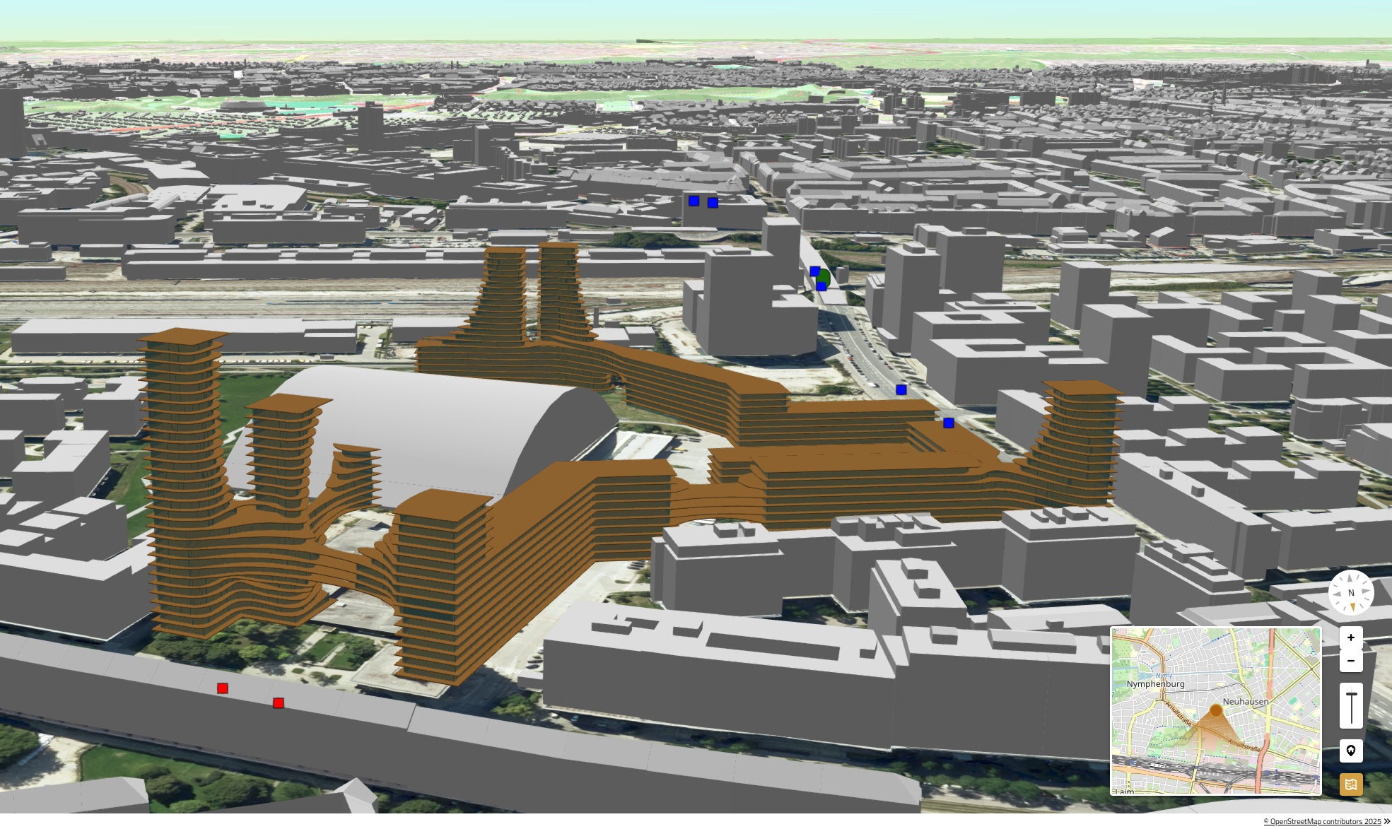 The Munich Paketposthalle area with different planning scenarios for high-rise buildings. The designs shown in this demo are not planned in reality and were only created in the course of the a student project.