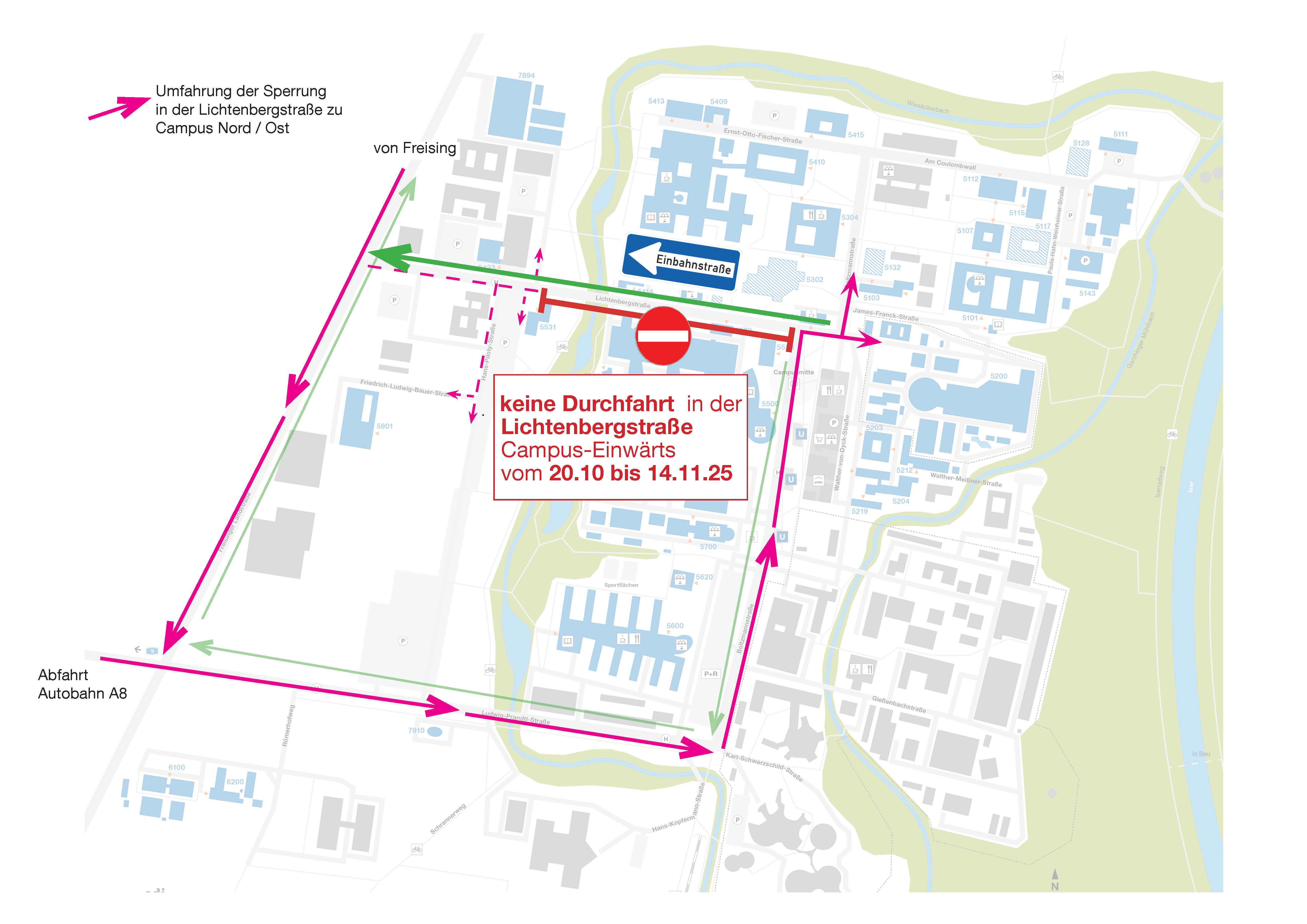 We kindly ask you to use the south entrance to access the campus. Please refer to the map for details. Access from Lichtenbergstraße to Mechanical Engineering, ZEI, Chemistry, etc. is still possible via the southern bypass.