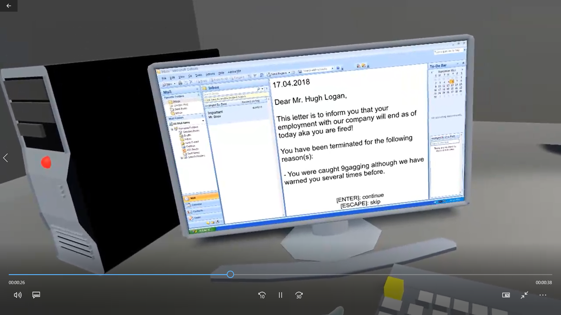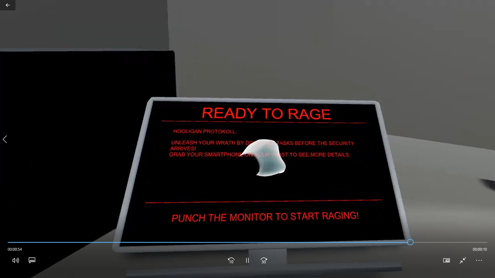 Office Hooligan is a first-person VR game where the players can destroy a specific place or situation by hitting or throwing objects. The chosen setting is an office room. The players slip into the role of devastated workers who want to quit. Thus, they plan to destroy the office room before they leave the company. To do this, they can hit or throw objects like writing tools, drink beer which can make the player feel drunk or scream to get people attention. Goal of this game is to do specific tasks which includes throwing the boss out of the building. In the end, the game sets during the funeral of the job where the two players then again run around destroying things.