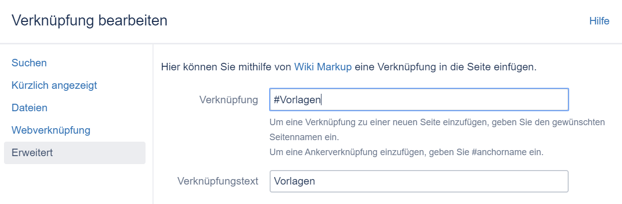 Ein Link zu einem Anker wird fast wie ein normaler Link erstellt. Unter dem Reiter "Erweitert" wird als Verknüpfung der Name des Ankers mit einer vorangestellten # eingetragen. Achtung: Groß- und Kleinschreibung werden beachtet! Hier: #Vorlagen |