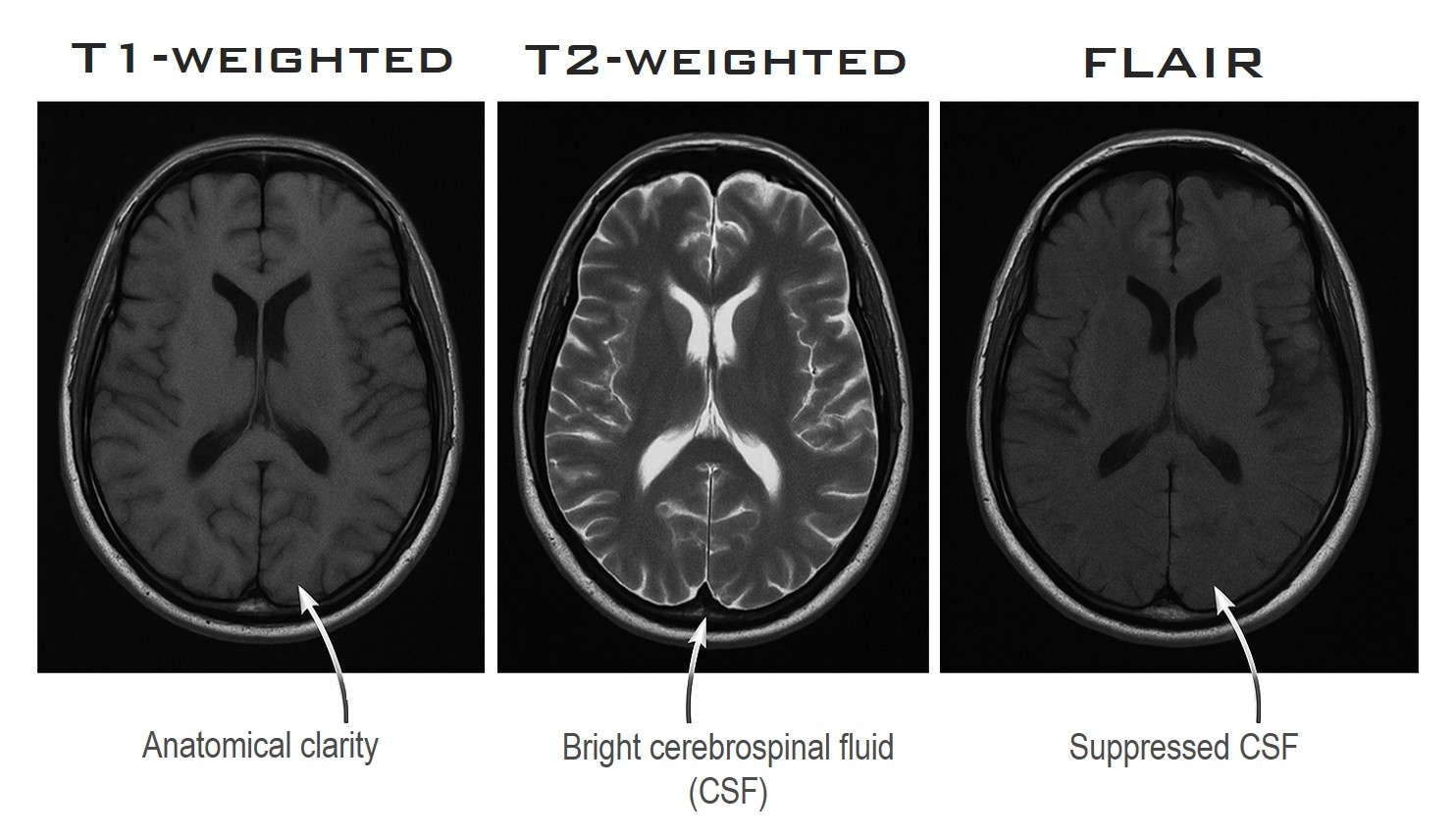Contrast depends on the timing of radiofrequency pulses and signal measurements. Common image types include: