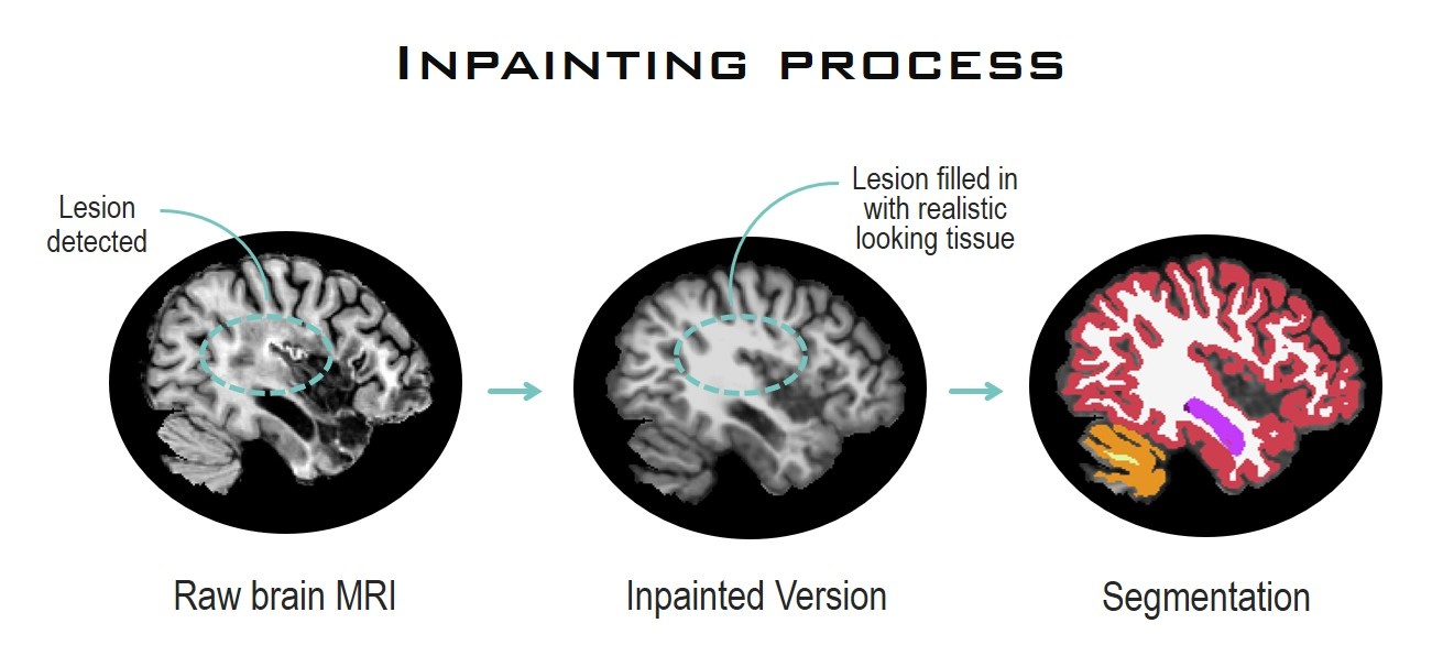 SynthSR takes a more balanced approach by using inpainting to fill in damaged areas with anatomically plausible, healthy-looking tissue. The goal is not to remove the lesion, but to adjust its appearance so that tools like FreeSurfer or FSL,