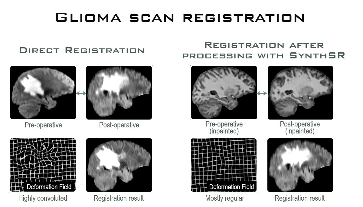 One promising use of SynthSR is improving image registration for brain tumor scans. In studies tracking glioma progression or treatment response, researchers often need to align pre- and post-operative MRI scans.