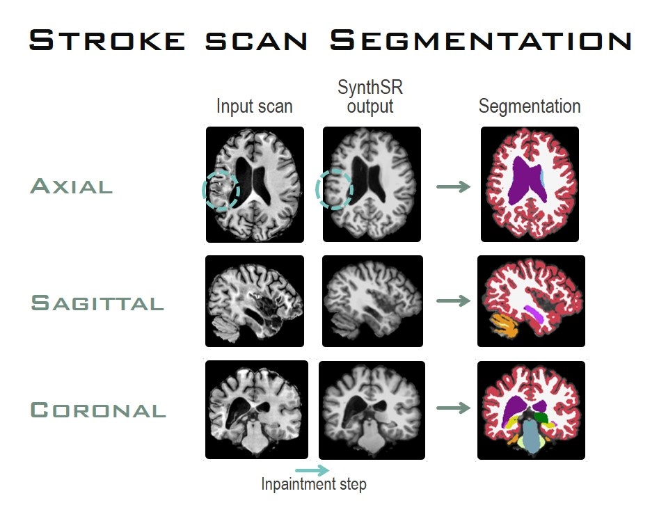 In addition, SynthSR includes a built-in inpainting step. In cases where the input scan contains lesions, such as those caused by tumors, strokes, or other pathologies, the model generates anatomically plausible tissue to fill in those areas. This allows standard tools, which often fail when encountering abnormal anatomy, to process the image as if it were healthy, enabling segmentation and registration in otherwise unusable scans.