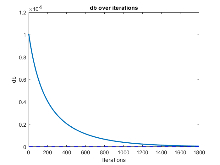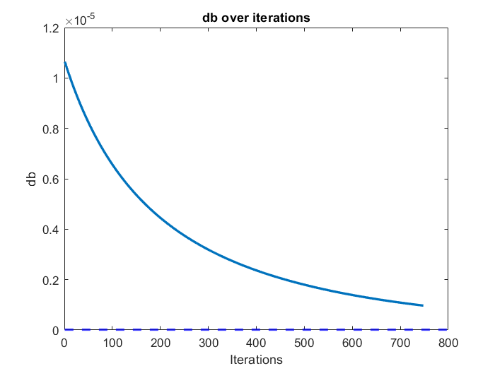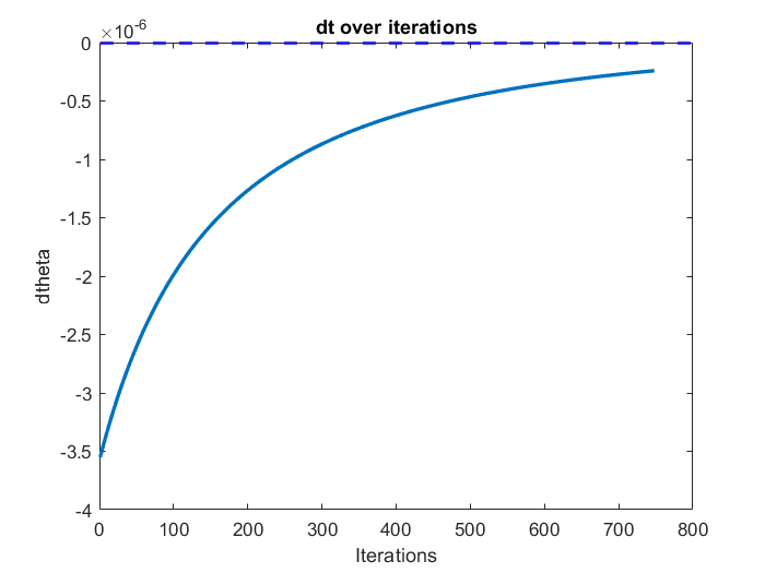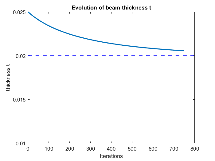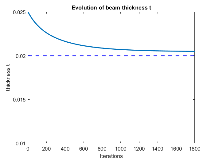 Indeed, considering these plots it can be concluded that algorithm is trapped in the valley of the objective function J(\bm{\theta}) corresponding to \begin{equation} t_m\end{equation} where gradients with respect to b are almost zero resulting in asymtotic convergence of updated beam widths \begin{equation} b_i\end{equation} towards "wrong" value of 0.0276 m .