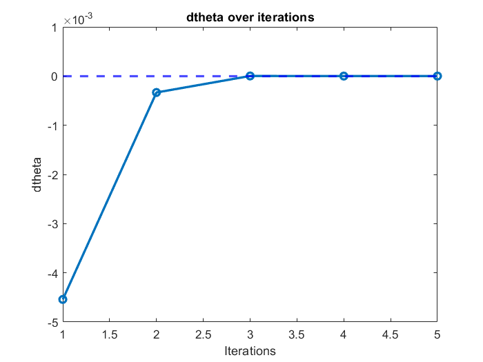 The number of equations is higher than the number of unknowns in an overdetermined case, and relation between forces (residual) and stiffness (updated parameters) is linear in the static case. Therefore the convergence of the error is achieved in only one iteration, obtaining the solution identical to the measured data. The system in this case is well-defined, therefore the algorithm finds the best-fit parameters that minimize the objective function, leading to full convergence.