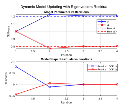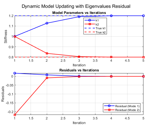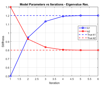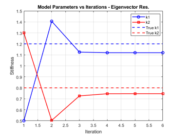 For the dynamic scenario, a two-degree-of-freedom system is considered, including two masses(\bm{m_1} , \bm{m_2} = 1) connected by two springs. The main objective is to update the stiffness values, \bm{k_1} and \bm{k_2} to their true values of \bm{k_{1,true} = 1.2 N/m} and \bm{k_{2,true}= 0.8 N/m} , respectively. Two methodologies are employed for this purpose; the first one is eigenvalue residual-based updating and the second one is eigenvector residual-based updating. These methods update the stiffness parameters during iteration to minimize the errors between predicted and true modal properties.
