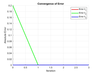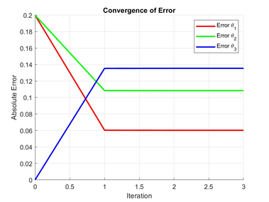 The convergence of the error does not reach zero since there are fewer equations than unknowns in underdetermined case, which makes it impossible to obtain an exact solution. Due to insufficient constraints, multiple parameter sets can satisfy the equations, and algorithm reaches a state where further iterations do not improve the accuracy, as the missing information prevents the system from fully resolving all unknowns. Therefore, the updating process may reduce the error to a certain extent but cannot eliminate it. To solve this issue, additional constraints or regularization techniques are often required to obtain a more accurate and stable solution.