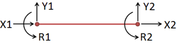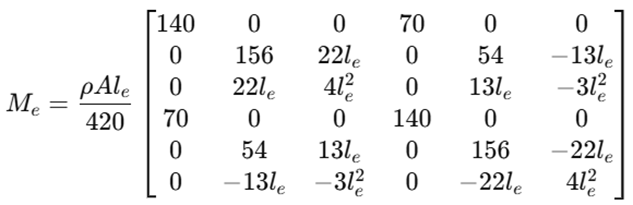 \[ K_e = \begin{bmatrix} \frac{AE}{L} & 0 & 0 & -\frac{AE}{L} & 0 & 0 \\ 0 & \frac{12EI}{L^3} & \frac{6EI}{L^2} & 0 & -\frac{12EI}{L^3} & \frac{6EI}{L^2} \\ 0 & \frac{6EI}{L^2} & \frac{4EI}{L} & 0 & -\frac{6EI}{L^2} & \frac{2EI}{L} \\ -\frac{AE}{L} & 0 & 0 & \frac{AE}{L} & 0 & 0 \\ 0 & -\frac{12EI}{L^3} & -\frac{6EI}{L^2} & 0 & \frac{12EI}{L^3} & -\frac{6EI}{L^2} \\ 0 & \frac{6EI}{L^2} & \frac{2EI}{L} & 0 & -\frac{6EI}{L^2} & \frac{4EI}{L} \end{bmatrix} \] |