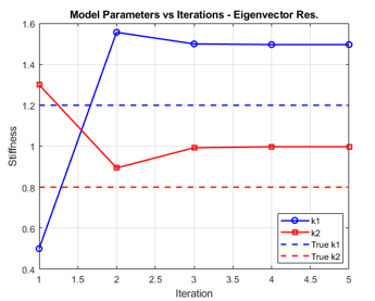 When modifying the initial guesses as \bm{\theta = \begin{bmatrix} k_1 = 0.5 \\ k_2 = 1.3 \end{bmatrix}} , the eigenvector residual method struggles to converge, as evident in the plot below. This issue can be weakened by reducing the regularization parameter to a small value such as \bm{\mu = 1x10^{-9}} through trial-and-error tuning. In contrast, the eigenvalue residual method works perfectly regardless of the starting point or regularization amplitude highlighting its robustness. These results suggest that while the eigenvector residual requires careful parameter tuning, whereas the eigenvalue residual method provides a more robust solution framework.
