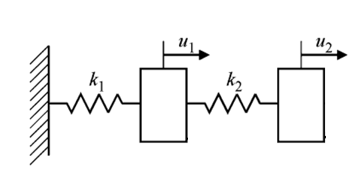 3) Construct stiffness and mass matrices: \mathbf{K} = \begin{bmatrix} k_1 + k_2 & -k_2 \\ -k_2 & k_2 \end{bmatrix}, \mathbf{M} =\begin{bmatrix} 1 & 0 \\ 0 & 1 \end{bmatrix}