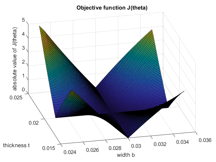Considering figures above it can be concluded that in case of two updated parameters the algorithm based on the eigenvalue residual fails to converge in both parameters to "true" values. Although, thickness t is being updated to true value \begin{equation} t_m\end{equation} , width b is being updated in the "right" direction (towards \begin{equation} b_m\end{equation} ), but stops half-way. Moreover, it is important to notice that in this case algorithm requires significantly more iterations for convergence, making overall sensitivity-based FEMU computationally more expensive. Such behaviour could be explained by consideration of the absolute value of the objective function J(\bm{\theta}) in case of two updated parameters depicted in the figures below: