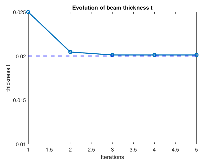 Here true thickness \begin{equation} t_m\end{equation} and true width \begin{equation} b_m\end{equation} was set to 0.02 m and 0.03 m , respectively, and initial guessed thickness t_1 and width b_1 both were chosen to be equal to 0.025 m .