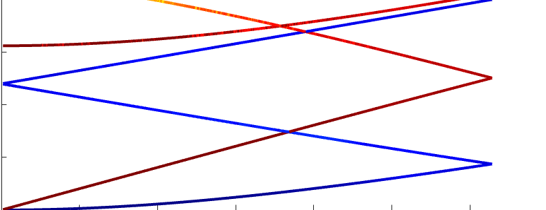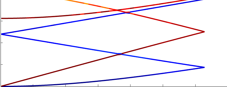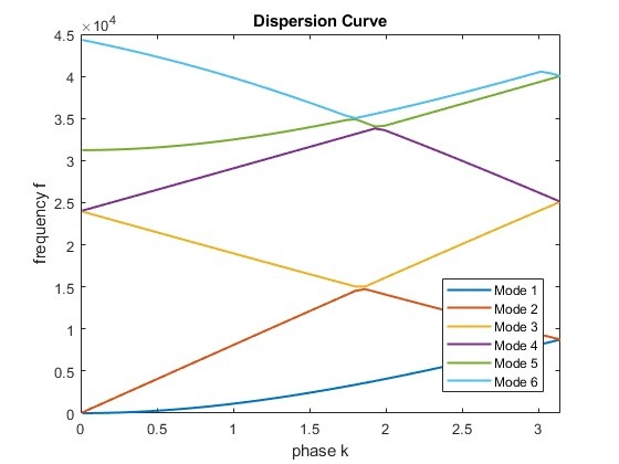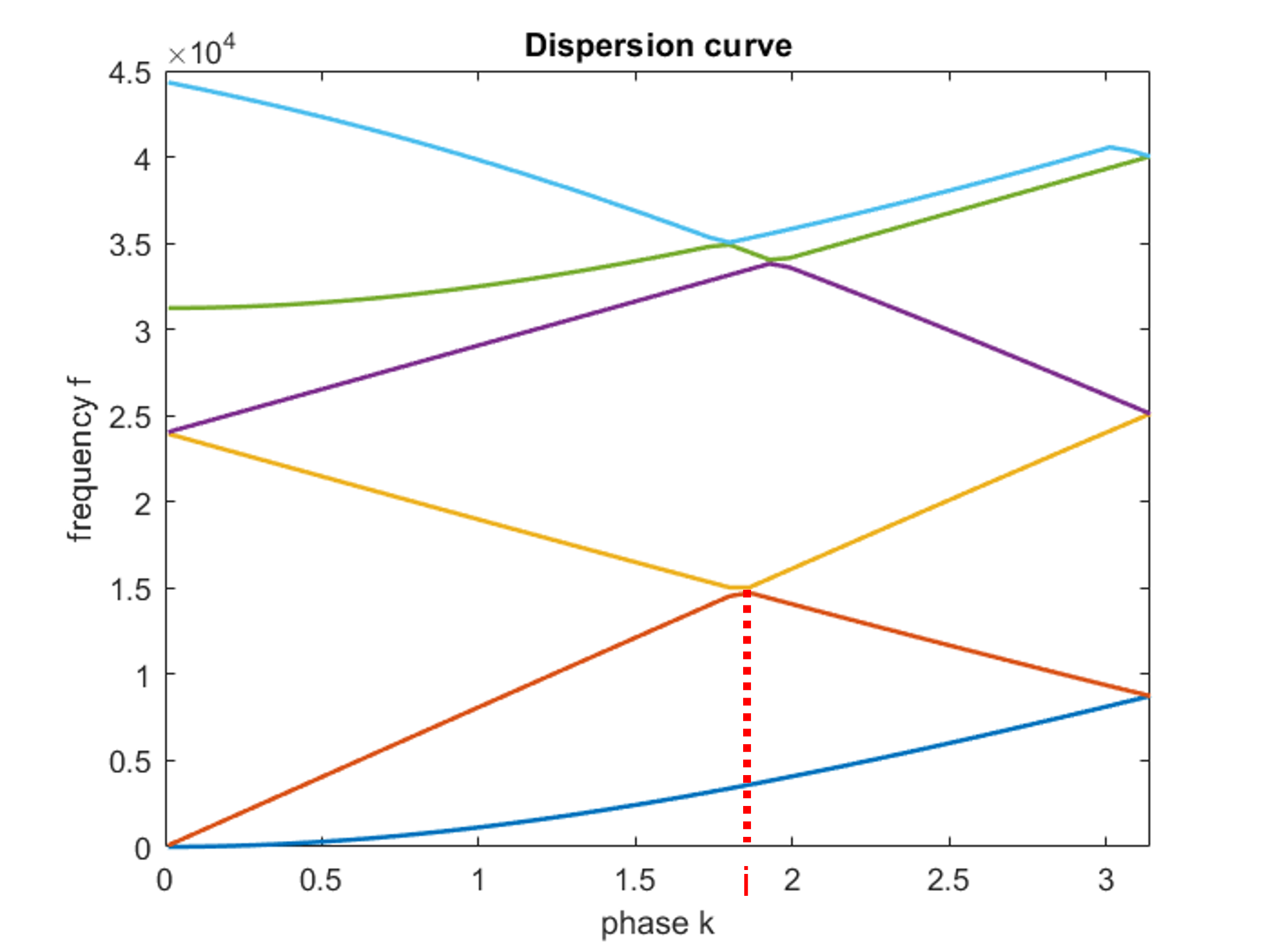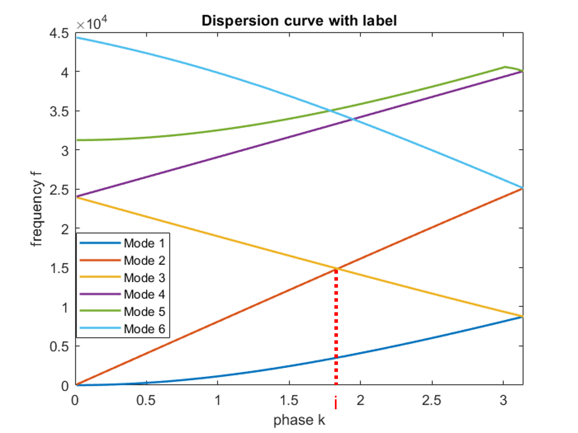 For example, T1(2,3) is the minimum element in the second row, and this shows that the second eigenmode should be connected to the third eigenmode. T1(3,2) is also the minimum in the third row. This result shows that, at the phase k = i, the second and third dispersion curve are crossing each other, and through this eigenmode tracing method, the second eigenmode and the third eigenmode is switched (Figure 2.2). The reason is that the values in the cost matrix shows that switching the eigenmodes at current phase(k = i) could ensure the difference within the eigenmodes to be minimum.