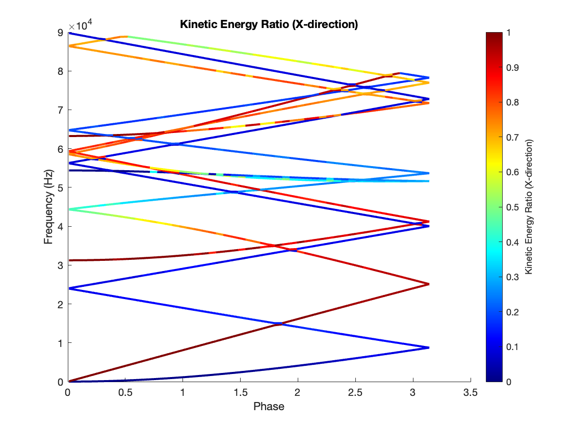 To simplify the analysis problem, we continue to use the previous 2D model, the two images depict the kinetic energy ratio in the X-direction as a function of frequency (vertical axis) and phase (horizontal axis) for 20 energy bands at different phase resolutions: