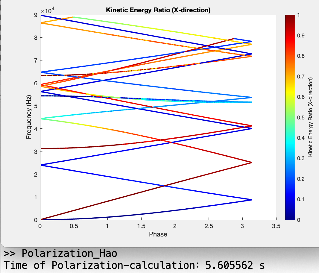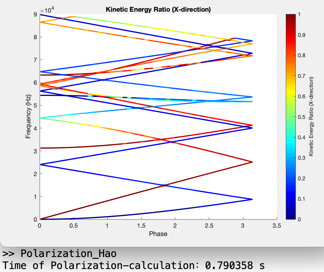 The polarization method exploits the directional distribution of kinetic energy to distinguish between wave modes. By analyzing the kinetic energy ratios along different spatial directions, this method accurately classifies longitudinal, transverse, and mixed modes. The resulting color-coded visualizations of dispersion curves not only enhance our understanding of mode evolution but also confirm the effectiveness of the matching approach, especially in higher frequency regimes where mode complexity increases. Despite the fact that mode polarization method gives extensive information about the directional distribution of movements, further steps are required for the computer to track the mode.