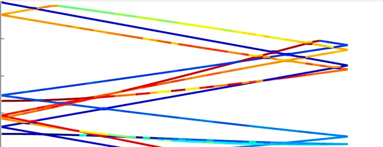 Figure 2.1 display the dispersion curves that needs for eigenmode tracing. The table T1 is the cost matrix computed at phase k, size of 6 x 6 indicates that we are interested in sorting the eigenmodes for the lowest 6 modes. The row number indicates the eigenmode at the current phase (k = i), and the column number represent the eigenmode at the next phase (k = i+1) . In each row, the minimum value has been colored with red, and the coordinate of this value indicates the correct match of the eigenmode from current phase (k = i) to the next phase (k = i+1).