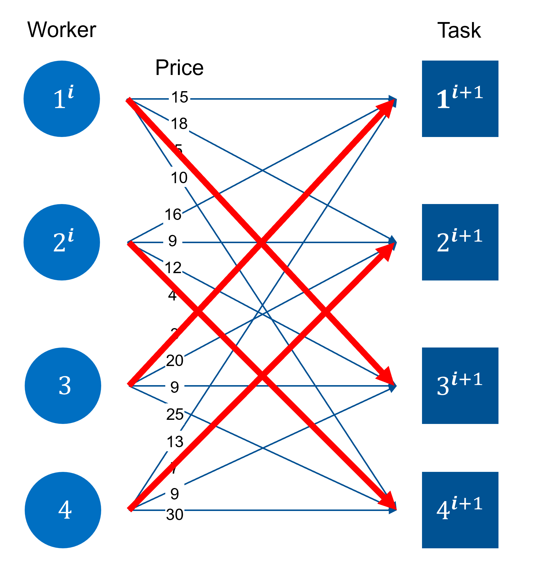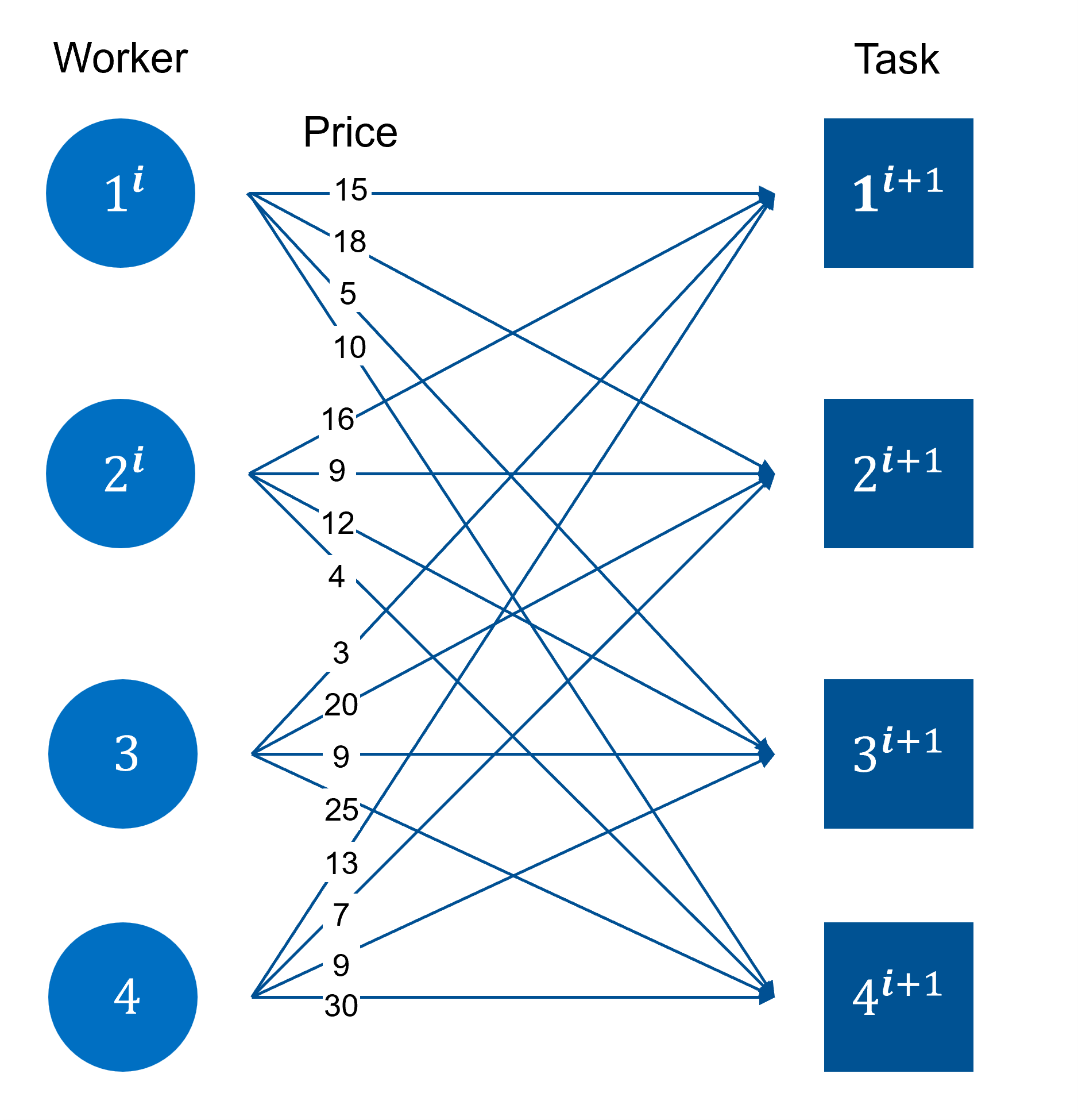 Hungarian Algorithm [3] is an optimization algorithm to deal with optimal assignment problem. The concept shown by the Bipartite graphs in Figure 2.1 and Figure 2.2 describes how Hungarian Algorithm matches eigenmodes. The optimal assignment problem involves finding a one-to-one mapping between two sets of nodes, where each edge connecting a pair of nodes which is associated with a specific cost. The goal is to determine a matching that minimizes the total cost across all selected edges. For example, there are 4 workers that need to be assigned to a task with specific cost, assigning every task with a worker by the minimum cost is the goal.