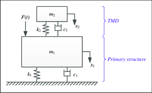 The system consists of two masses: the primary structure with mass m1, and the secondary mass (TMD) with mass m2. The primary structure is subject to a force F(t), which can be external excitation like wind or seismic loading. The TMD is a secondary mass connected to the primary structure via a spring with stiffness k2 and a damping element with damping coefficient c2. The spring and damper work together to reduce the vibrations of the primary structure by tuning the TMD to the resonant frequency of the structure.