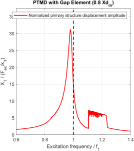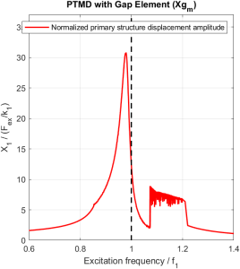The steady-state analysis for the Pounding Tuned Mass Damper (PTMD) system focuses on assessing the damper’s effectiveness in reducing vibrations across a broad frequency range. This ensures that the PTMD performs well in both sub-resonant and super-resonant conditions, going beyond just resonance and providing a comprehensive solution for vibration mitigation.