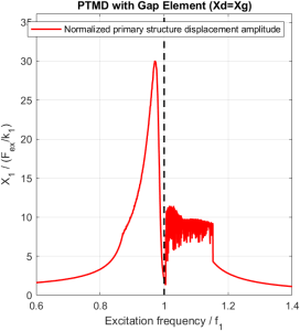 - Larger Xg: Increases the frequency of impacts, which enhances the PTMD’s damping capabilities. However, if the gap is too large, it can lead to an overly aggressive impact mechanism that may dampen the primary structure too early, affecting the system’s natural dynamics.