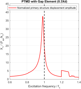 - The gap element plays a pivotal role in the PTMD’s ability to absorb and dissipate energy during impacts. Fine-tuning the gap distance (Xg) in relation to the primary structure’s natural frequency is essential for achieving the ideal balance between damping efficiency and minimizing unnecessary impacts. More simulations will be required to precisely determine the optimal range for Xg, considering dynamic loading conditions and resonance behaviors across different frequencies.