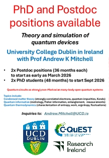 These positions in theoretical physics are funded by /Research Ireland/ through the project "/Quantum Circuit Simulators/" in which we treat quantum devices as strongly non-Markovian many-body open quantum systems. Recent publications from the group can be found here (https://www.ucd.ie/nanoelectronics/publications).