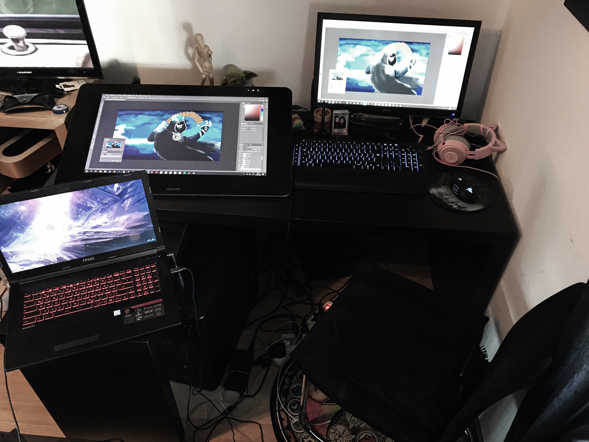 Auf meinem Schreibtisch wird es mit dem Platz langsam etwas eng, aber bequemes Sitzen war noch nie meins. Das Zeichnen auf dem Tablet ist auf Dauer leider arg ungemütlich, da ich mich immer etwas verrenken muss und die Bilder sehr lange brauchen.. zudem muss ich aufpassen, dass ich mit dem Stuhl nicht die Kabel erwische..