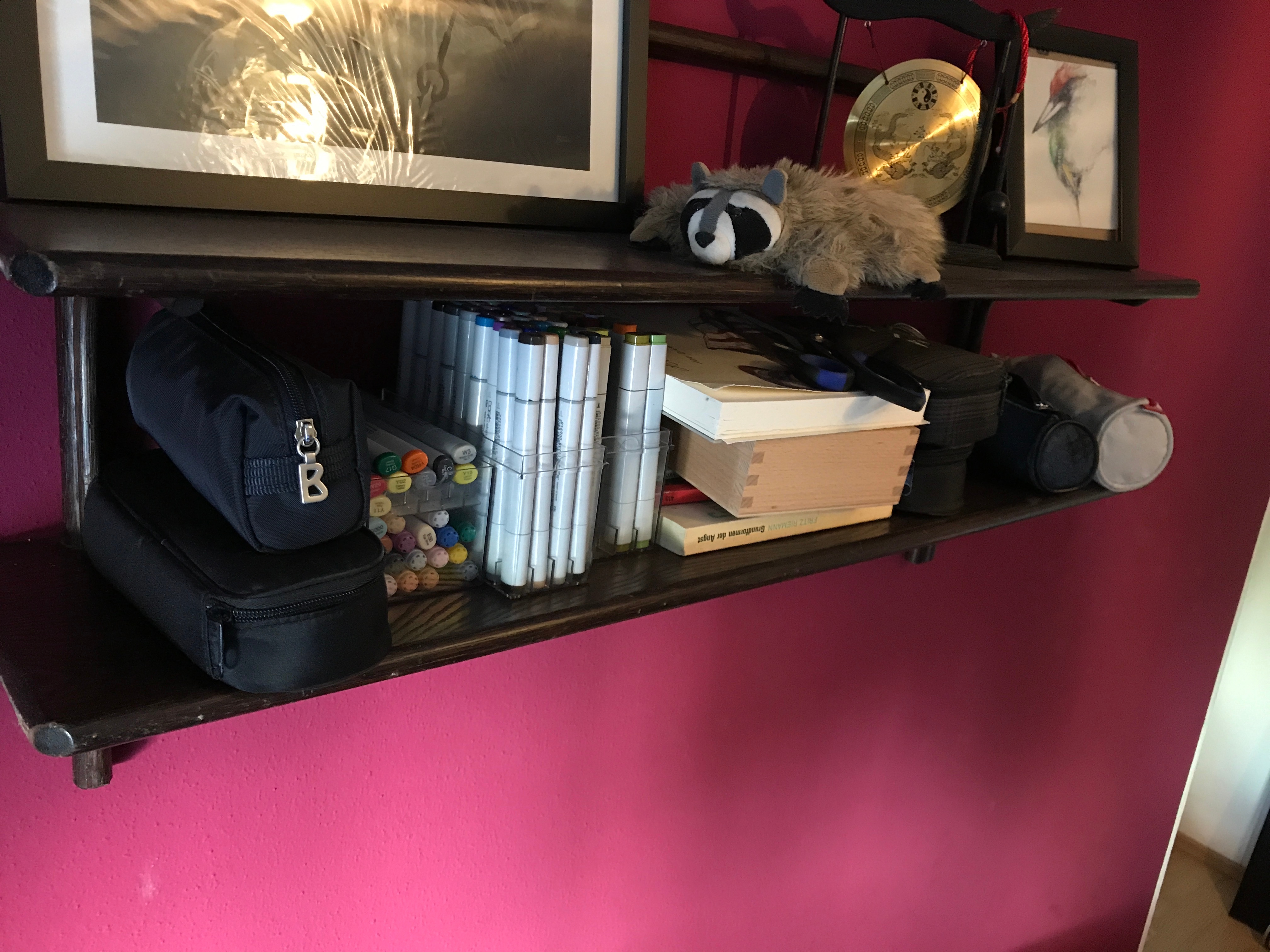 Analoges Zeichnen/Malen findet seit je her meistens auf meinem Bett statt, da der Schreibtisch dafür keine Kapazitäten mehr hergibt. In greifbarer Nähe sind einige meiner Stifte im Regal und unter dem Bett eine Menge Zeichenpapier und noch mehr Stifte, Aquarell- und Acrylfarben (genaue Zahl unbekannt).