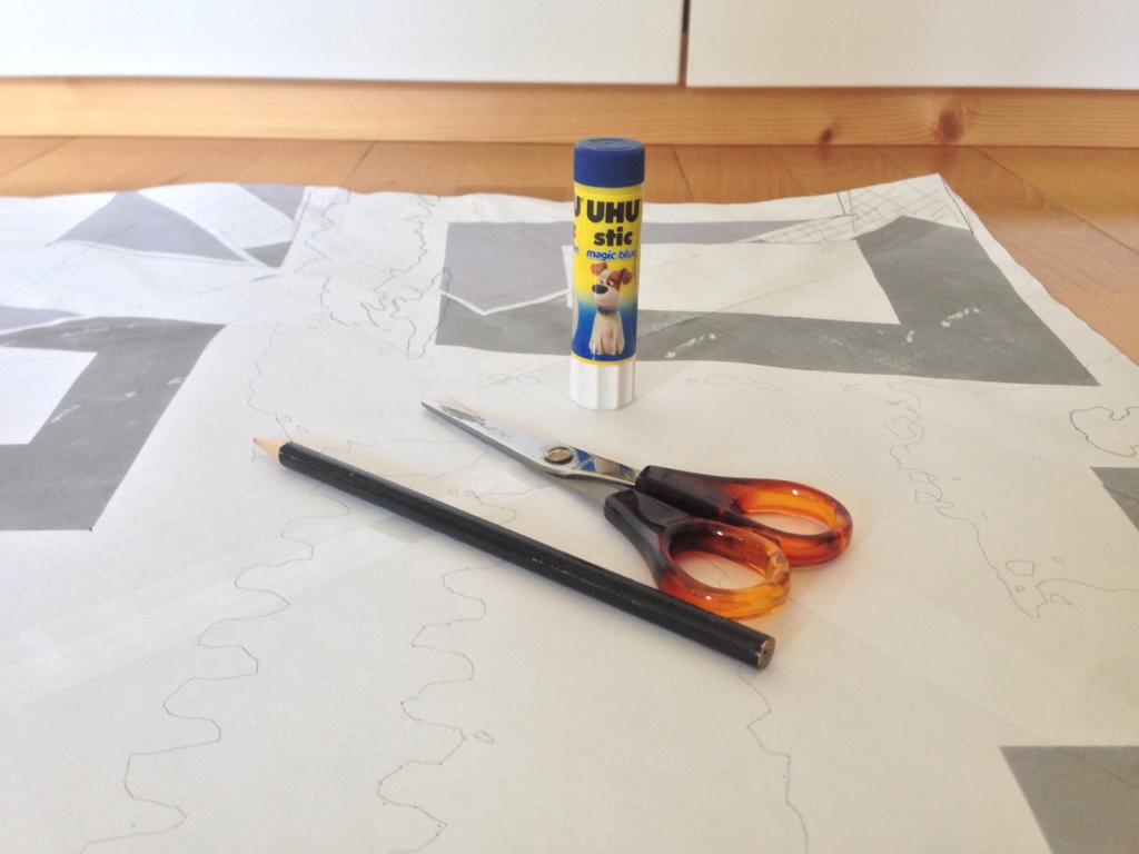 Freitagmorgen: Das große Kleben beginnt. Im Keller habe ich einen Klebestift aus Schulzeiten gefunden – die Sorte, die zunächst blau ist und dann durchsichtig wird.