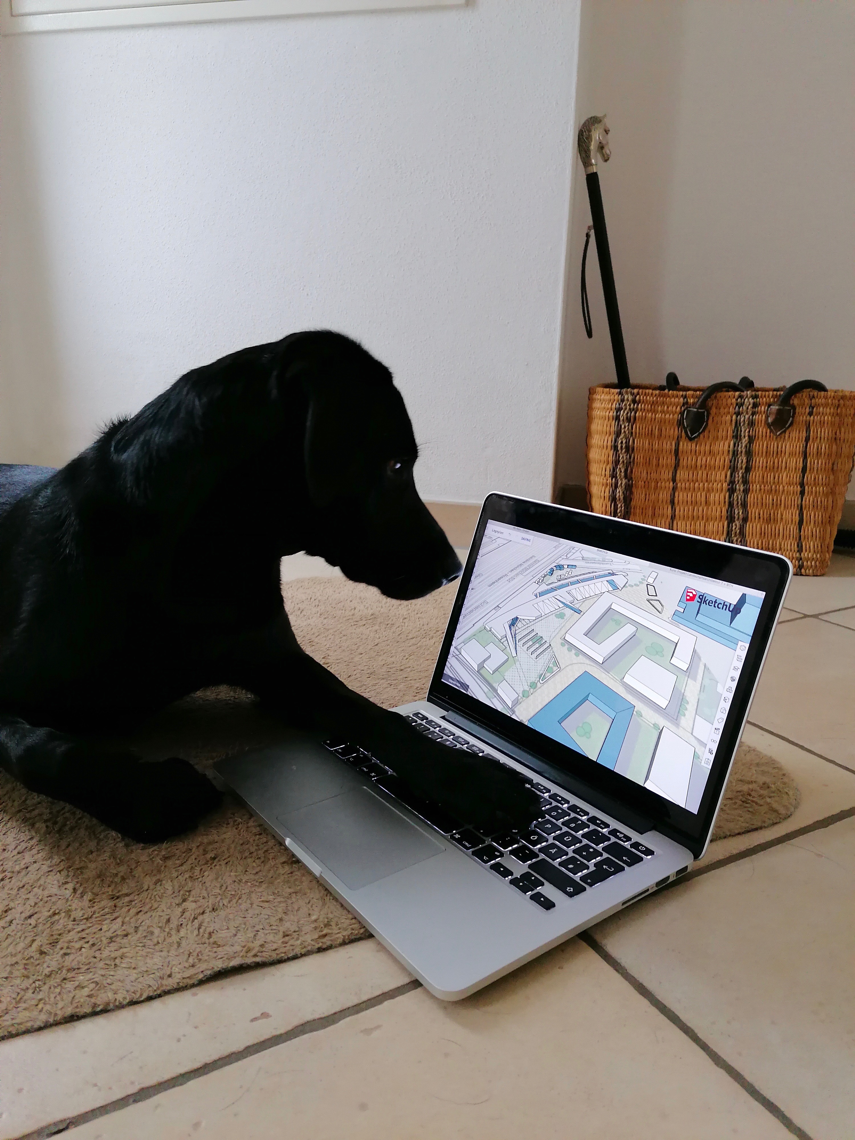 Das gute am Homeoffice ist, dass ich jederzeit meine übermotivierte, vierbeinige und sehr haarige Assistentin zur Hand habe, die zufällig über ausgezeichnete SketchUp Kenntnisse verfügt. Daher musste ich mich nicht weiter um das kleine „Linien-Problem“ kümmern, sondern konnte all die Arbeit bei ihr abladen. Während sie sich tatkräftig auf mein Projekt stürzte und auf Basis meines Lageplans ein Modell formte, konnte ich mich gemütlich zurücklehnen. Mit vier Pfoten geht die Arbeit schließlich doppelt so schnell und innerhalb kürzester Zeit war sie fertig. Nun hatte ich nicht nur ein 3D Modell, welches mir verdeutlichte ob meine Gedanken zur 2D Version des Lageplans funktionierten, sondern auch unzählige Vorlagen für Perspektiven, die später mit Photoshop bearbeitet werden können.